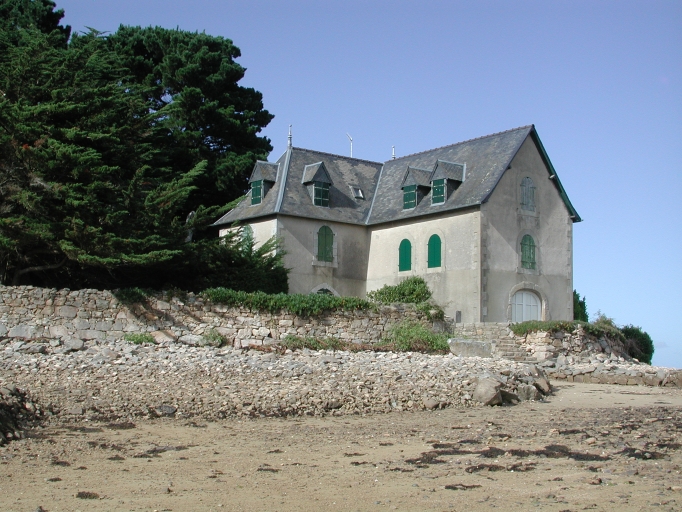 Vue générale du bâtiment principal de l'île : remarquer les murets littoraux, l'escalier de descente à la grève et la petite jetéeImmatriculation
