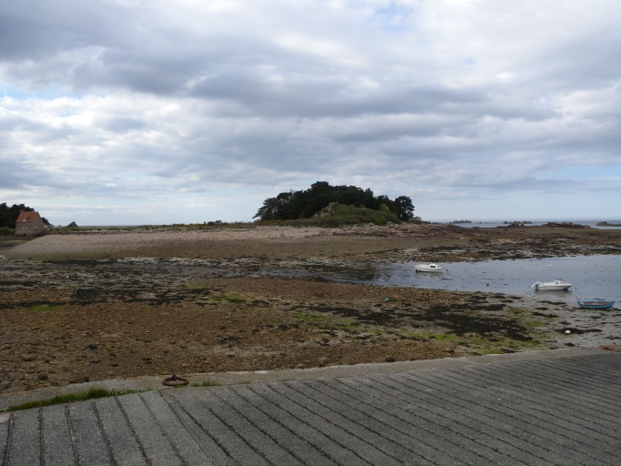 Vue de l'Île Ozac'h et du cordon de galets qui protège la cale et le port des vents de Nord-OuestImmatriculation
