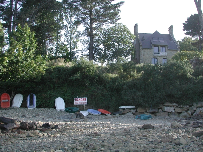 Vue de l'extrémité de la micro-falaise de Pelllinec, en limite du Port-Blanc : remarquer la belle architecture balnéaire au bord de la falaiseImmatriculation