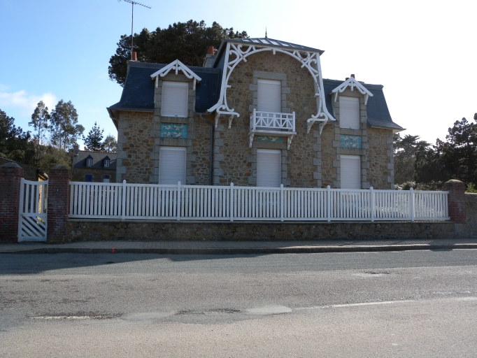 Vue d'une habitation traditionnelle en front de port, inspirée de l'architecture balnéaire : remarquer la mosaïque murale et les appendices en boisImmatriculation