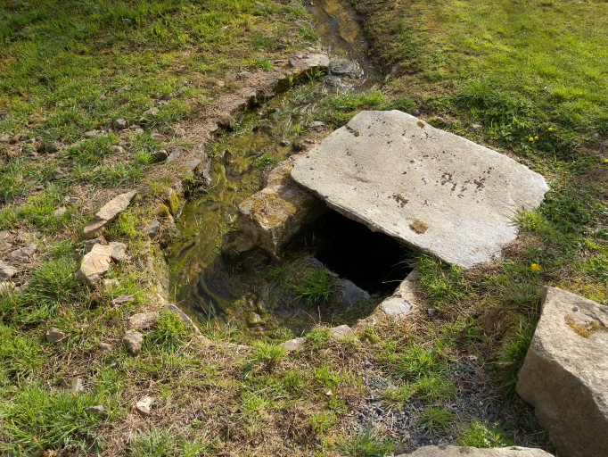Vue de détail de la fontaine recouverte d'une dalle de schisteImmatriculation