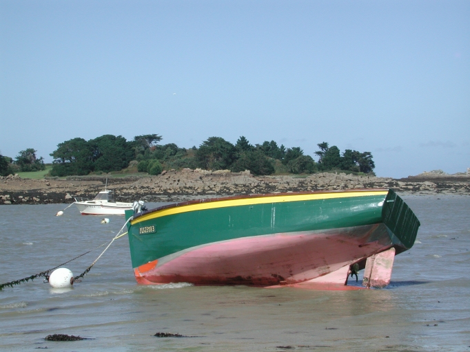 Vue d'un canot de plaisance, immatriculé PL 523183, creux de 5 m de long, non gréé (Port-Blanc)Immatriculation