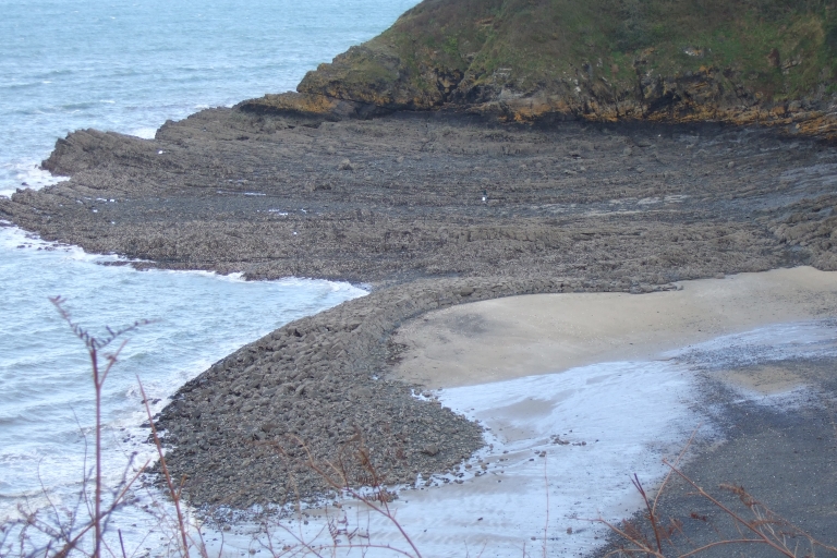 Vue du Petit-Havre de Pordic et des Roches-Blanches à marée basse : remarquer la forme étalée à son extrémité de la digue-abri (Yves Lamour, collection particulière)Immatriculation