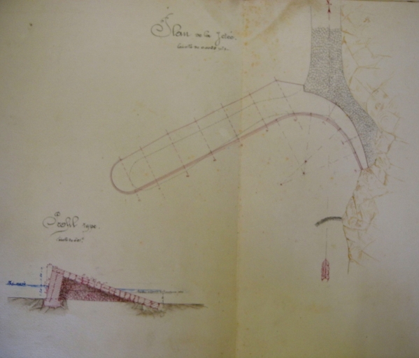 Plan de la jetée-abri projetée en 1864 au Havre de l'Hermot : remarquer le musoir et le profil (AD 22)Immatriculation