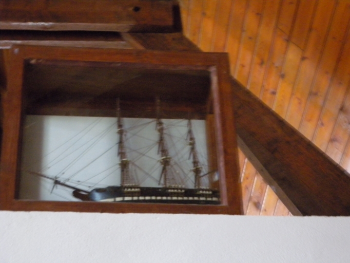 Vue d'un second trois mâts gréé en navire marchand, disposé sur une poûtre de la chapelleImmatriculation