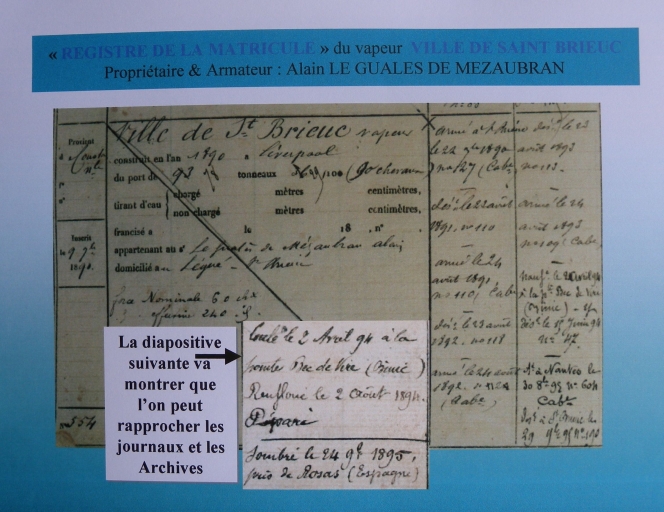 Extrait du registre matricule du vapeur 'Ville de Saint-Brieuc', à l'armateur du Légué, Alain Le Guales de Mézaubran, fin 19ème siècle (reproduction, montage, Jacques Hervé)Immatriculation