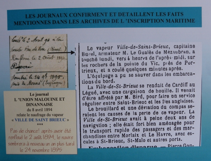 Extrait du journal 'L'Union malouine et dinnanaise du 8 avril 1894 relatant le naufrage du caboteur 'Ville de St-Brieuc' (reproduction, montage, Jacques Hervé)Immatriculation