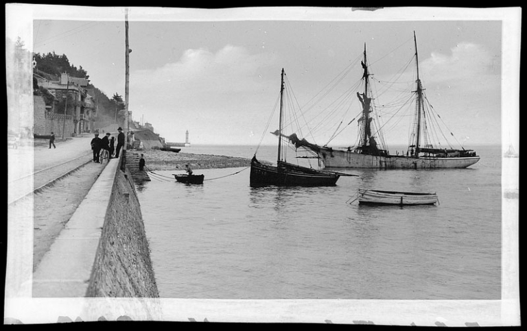 Bateau terreneuvier et sloop de pêche devant la place de la Douane, en aval du phare, vers 1917 (AD 22, Lacombe)Immatriculation