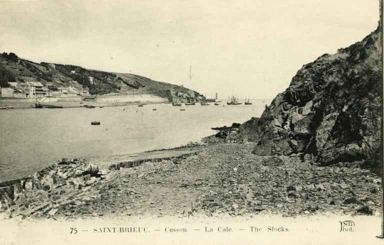 Vue en 1920 de l'ancienne cale, aujourd'hui détruite, à l'usage des marins-pêcheurs de Cesson (carte postale, AD 22)Immatriculation