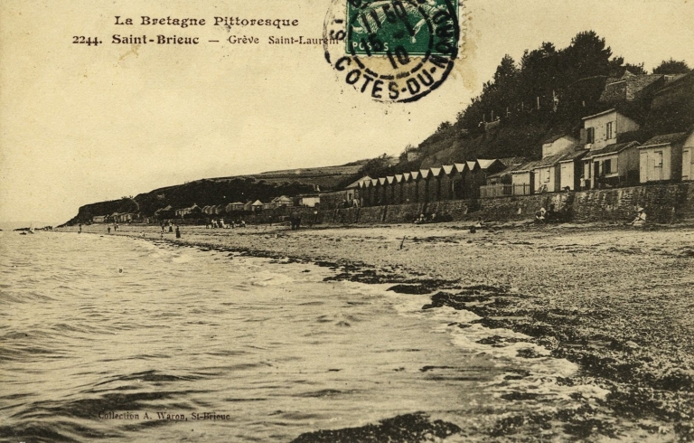 Cabines de bain sur la plage de Saint-Laurent, vers 1910 (carte postale, AD 22)Immatriculation