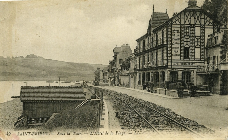 Vue du front de port 'Sous-la-Tour', en aval , vers 1910 : l'Hôtel de la Plage' devant la nouvelle ligne de chemin de fer (carte posale, AD 22)Immatriculation