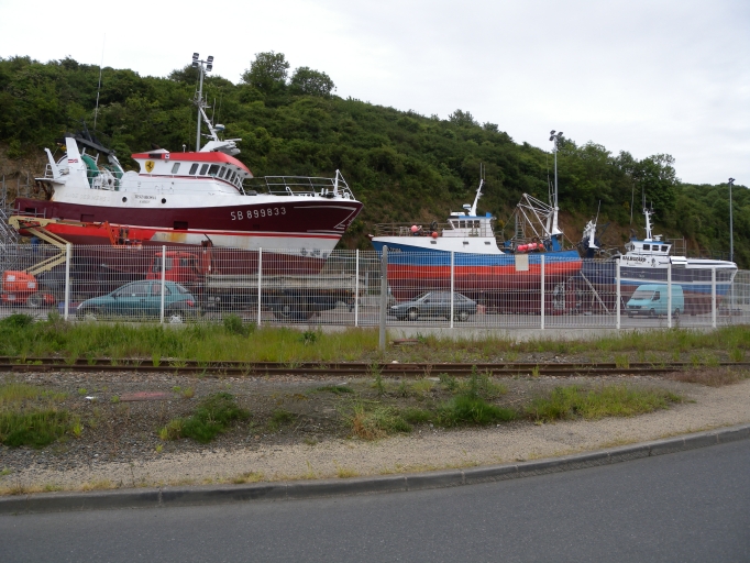 Vue des bateaux de pêche en carénage ou en réparation sur le terre-plein aménagé en face du quai SurcoufImmatriculation