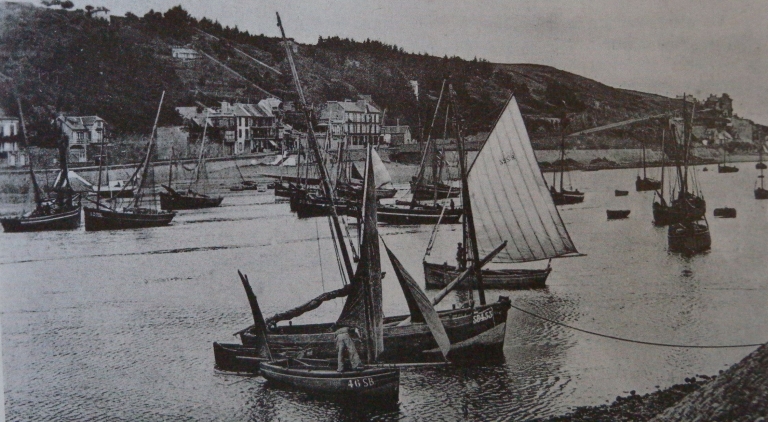 Bateau de pêche au Légué, 2ème quart 20ème siècle : remarquer le sloop aux laizes verticales, avec sa grande trinquette endraillée : la 'Mich' (carte postale, collection particulière)Immatriculation