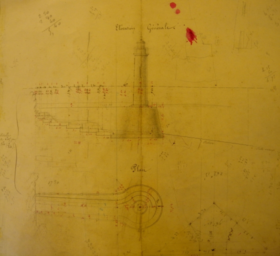 1er projet : plan du fanal du Légué, 1851, élévation génarale et plan de la jetée (AD 22)Immatriculation