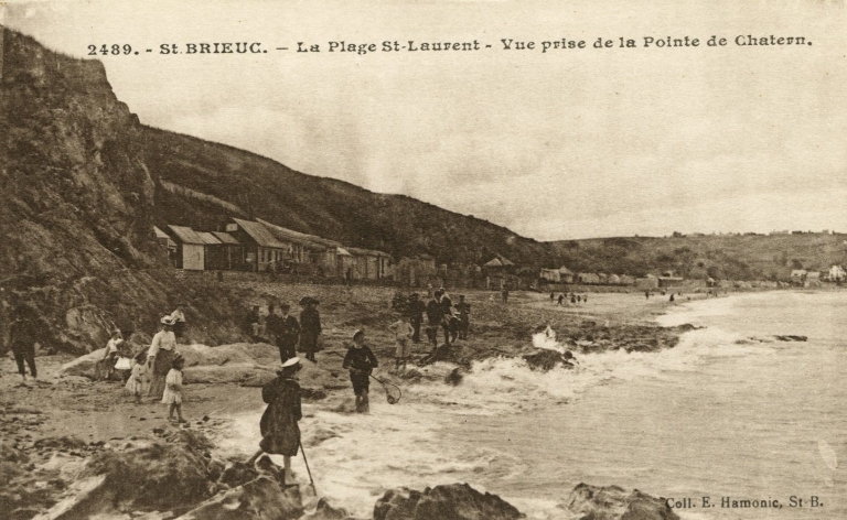 Cabines de bain sur la plage de Saint-Laurent, vers 1917 (carte postale, AD 22)Immatriculation