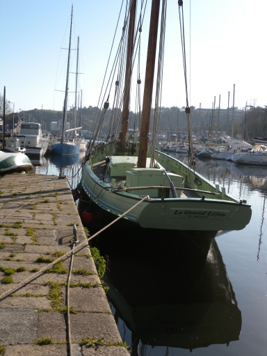 Vue du 'Grand Léjon' dans le port du Légué : remarquer la largeur de la coque, très épaulée et le tableau arrière avec sa courte voûteImmatriculation