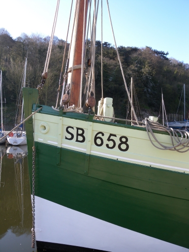 Vue de l'étrave à moustaches du 'Grand Léjon' : remarquer le haut franc-bordImmatriculation