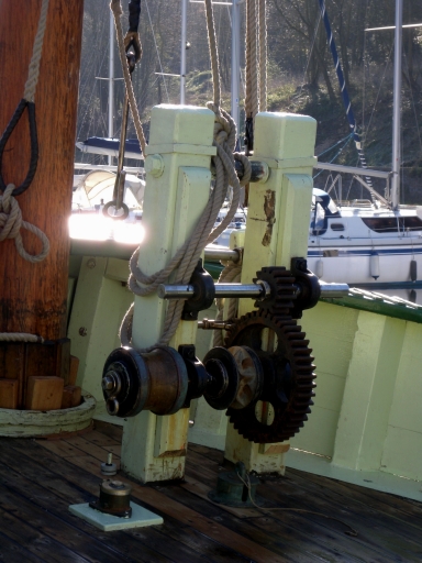 Vue du guindeau reconstitué sur le pont avant, avec les deux pignons et le barbotinImmatriculation