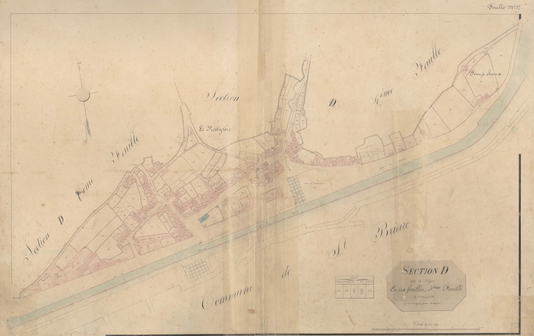 Extrait du cadastre de 1813 : le front de port du légué, section D, feuille n° 17 : le four à chaux, la cale de construction face au quai de Nemours (AD 22)Immatriculation