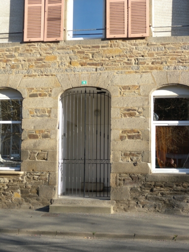 Vue de l'une des portes d'entrée de l'immeuble, avec son arc de décharge : la façade en moellons de schiste et les encadrements en pierre de graniteImmatriculation