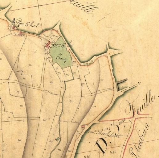 Extrait du cadastre de 1829, E863-864-867 2ème feuille : moulin à eau et étang de Kerhos, aujourd'hui disparu (AD 22)Immatriculation