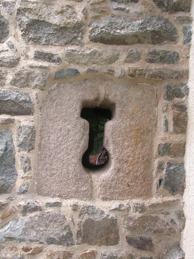 Vue de la forme en '8' de l'ouverture du type 'bouche à feu', située à droite de la porte d'entrée, façade Sud du moulinImmatriculation