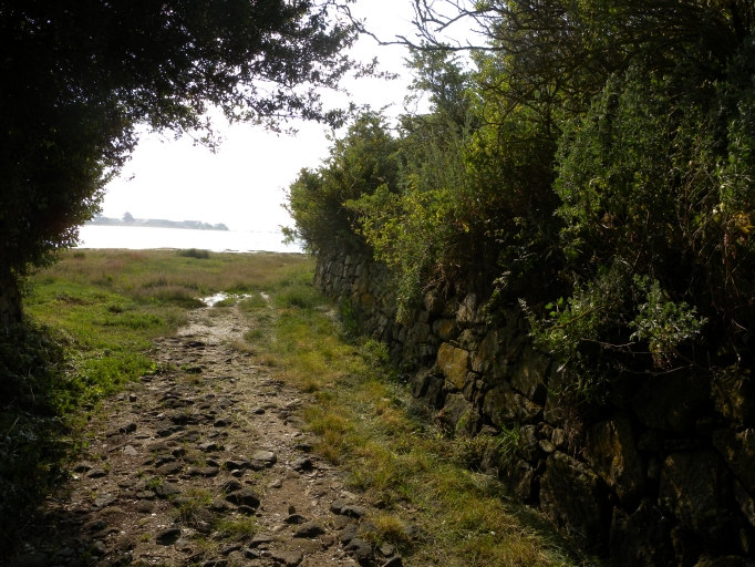Vue d'un sentier littoral menant à la grève (baie de Lanros), entouré de murs-talusImmatriculation