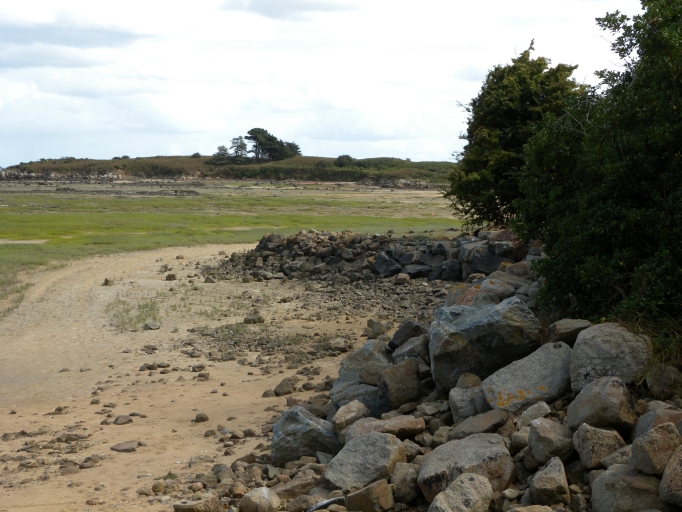 Vue des enrochements qui protège le rivage proche de la chapelle, en aval, côte Sud, et l'Île Koalen à l'EstImmatriculation