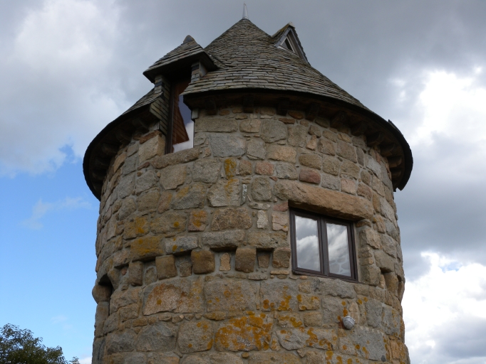 Vue de la façade Sud du moulin : remarquer l'encorbellement à corbeaux et les ouvertures, dont l'ancien huteauImmatriculation