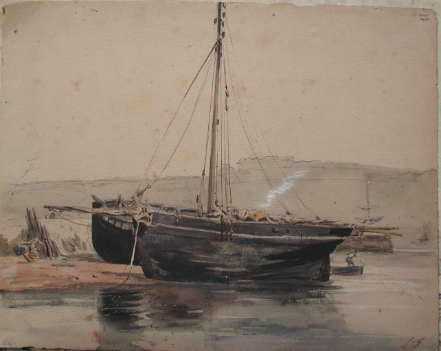 Huile sur carton de Louis-Marie Faudacq : gabarres échoués sur une rive du Trieux, 1er quart 20ème siècle (collection particulière)Immatriculation