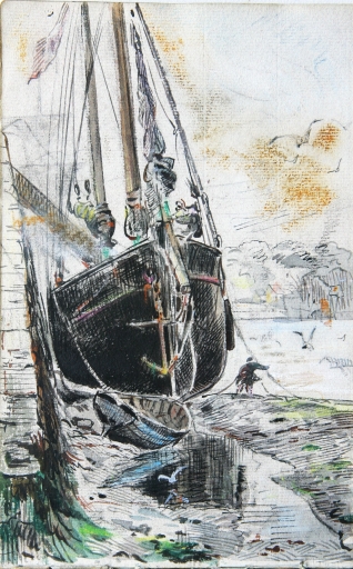 Dessin aquarellé de Louis-Marie Faudacq : dundee en déchargement dans un port du Goëlo, 1er quart 20ème siècle (collection particulière)Immatriculation