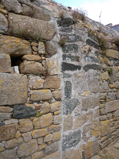 Vue de détail du mur Nord avec les vestiges de l'ancienne arcade en plein cintre, dont les arcs sont en pierre verte volcaniqueImmatriculation