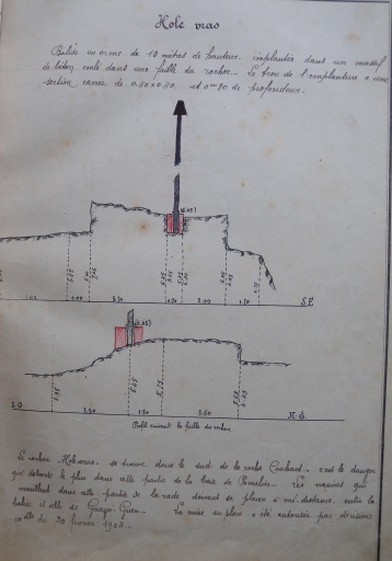 Dessin de la balise, perche en bois de Hole Vras, située au Sud de l'Îlot Couhard,1904 (DDE 22, Phares et Balises)Immatriculation