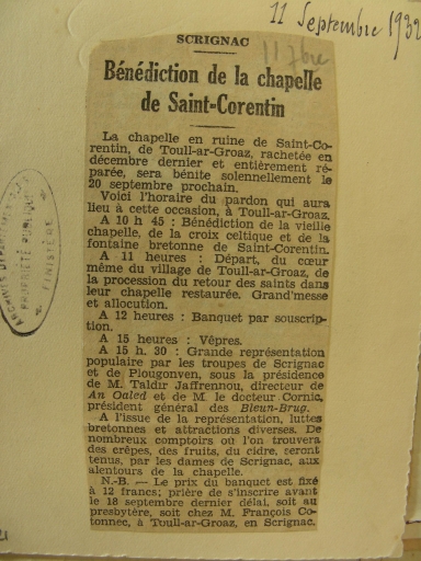 Bénédiction de la chapelle, 1932. Extrait d'un article de journal (A.D.Finistère, 34 J 75, fonds Le Guennec)Immatriculation