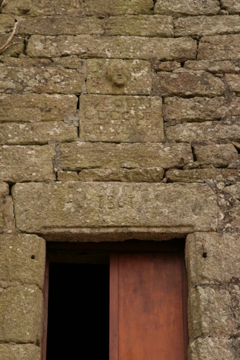 Grange. Détail de l'inscription et de la tête sculptée située au-dessus de la fenêtre du combleImmatriculation