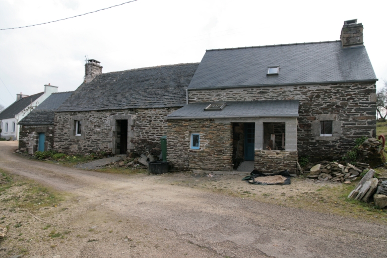 10, 11, 12. Alignement sud : logis à pièce unique, 1861; ancien logis-étable, 18e siècle façade sud remaniée début 20e siècle ; soue. Vue générale nord-ouest. Section D1 parcelles 50, 51Immatriculation