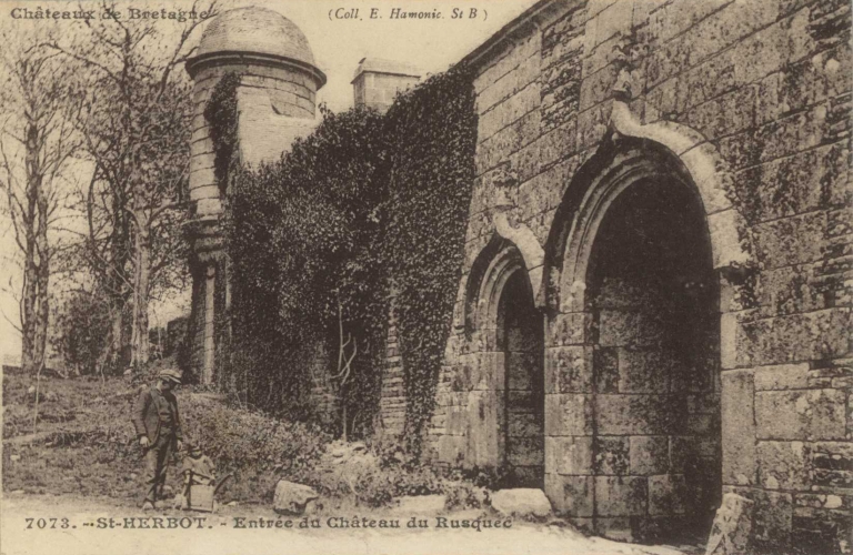 Porche du manoir et échauguette, carte postale ancienne vers 1920 (A.D. Finistère, 2 Fi 141)Immatriculation