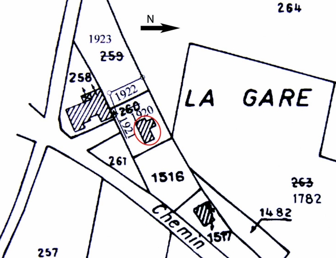 Localisation de l'élément sélectionné (fond : cadastre de 1986, section D 1)Immatriculation