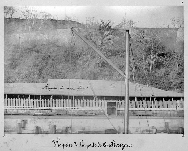 Vue de l'arsenal de Brest en 1880 depuis la porte de Quéliverzan : la Penfeld et le Magasin de vieux ferImmatriculation
