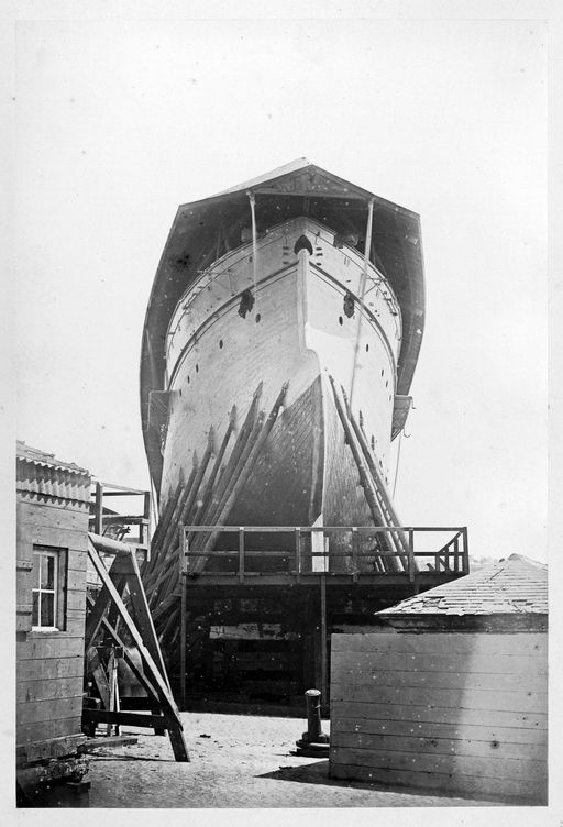 Vue de l'arsenal de Brest en 1880 : construction navale, proue du croiseur de 1ère classe Nielly (classe Lapérouse) à secImmatriculation