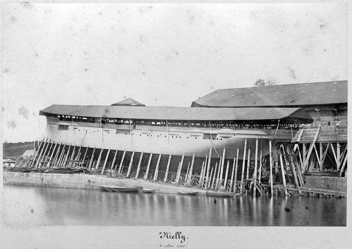 Vue de l'arsenal de Brest en 1880 : construction navale, croiseur de 1ère classe Nielly (classe Lapérouse) à sec sur son fer de lancement (4 mai 1880)Immatriculation