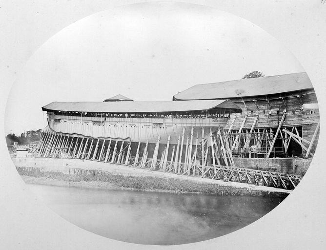 Vue de l'arsenal de Brest en 1880 : construction navale, croiseur de 1ère classe Nielly (classe Lapérouse) à sec sur son fer de lancement (4 mai 1880)Immatriculation