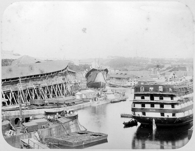 Vue de l'arsenal de Brest en 1880 : la Penfeld, les quais et les cales dite de la Boucherie. Lancement du croiseur de 1ère classe Nielly (classe Lapérouse) depuis la cale n° 4Immatriculation