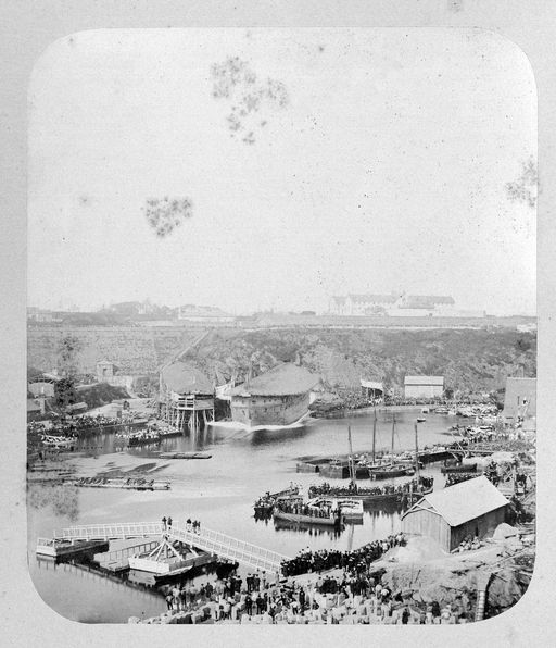 Vue de l'arsenal de Brest en 1880 : la Penfeld, les quais et les cales dite de la Boucherie. Lancement d'un navire de fort tonnage depuis la cale n° 1. Sur la falaise : les fortifications et la prison du BouguenImmatriculation