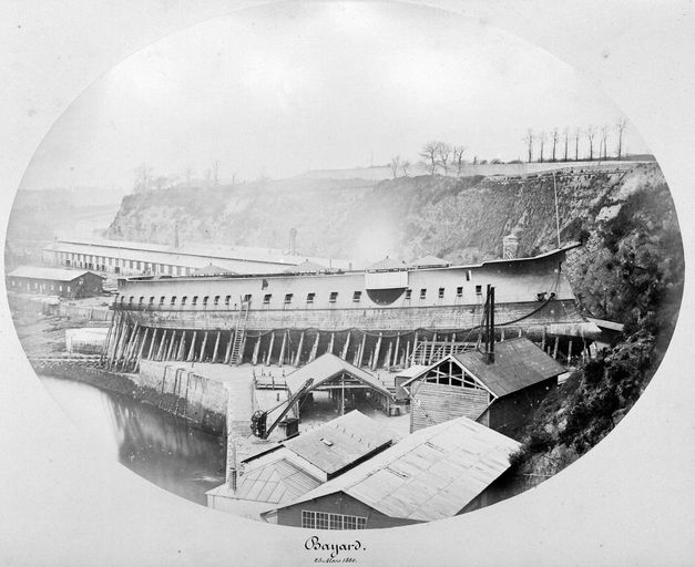Vue de l'arsenal de Brest en 1880 : la Penfeld, les quais et les cales dite de la Boucherie. Construction navale, le Bayard sur la cale n° 2 (25 mars 1880). Sur la falaise : le plateau du BouguenImmatriculation
