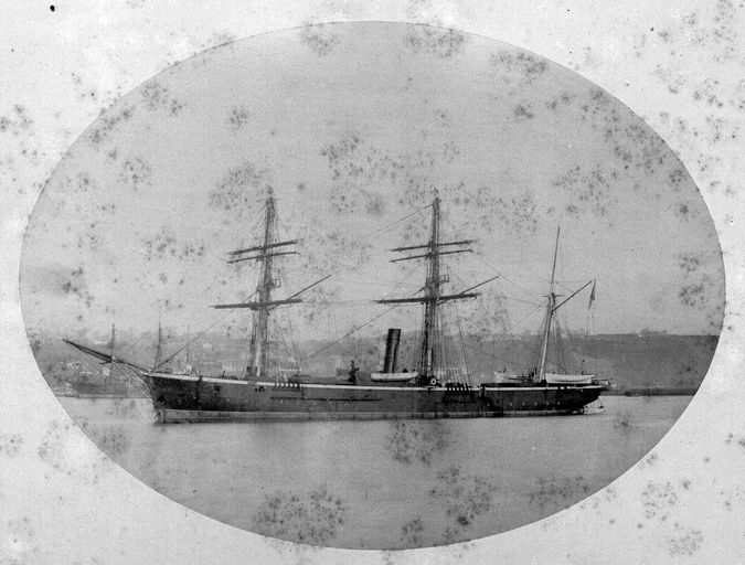 Vue de l'arsenal de Brest en 1880 : navire au mouillage en rade-abri. Navire à propulsion mixte (voile et vapeur)Immatriculation