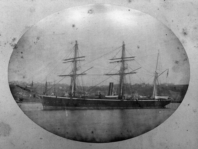 Vue de l'arsenal de Brest en 1880 : navire au mouillage en rade-abri. Navire à propulsion mixte (voile et vapeur)Immatriculation