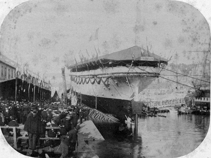 Vue de l'arsenal de Brest en 1880 : la Penfeld et le quai. Lancement du d'Estaing, croiseur de 2ème classeImmatriculation