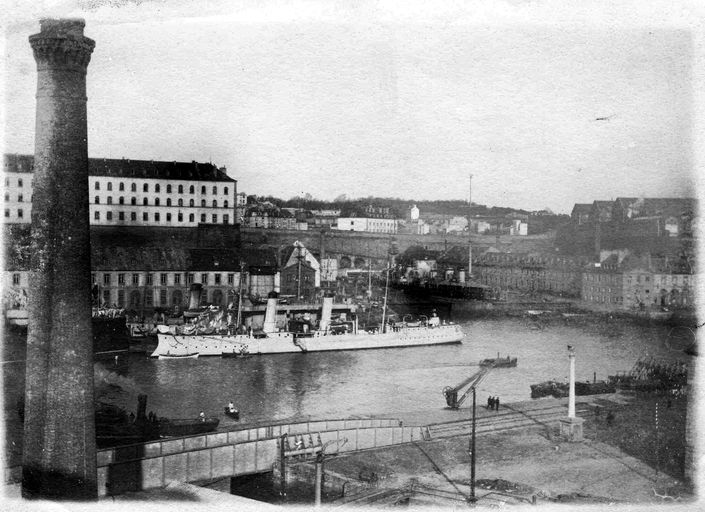 Vue de l'arsenal de Brest vers 1880 : formes de construction, bassins de radoub de Pontaniou dits formes de Pontaniou. La Consulaire se dresse sur le quai au premier plan à droiteImmatriculation