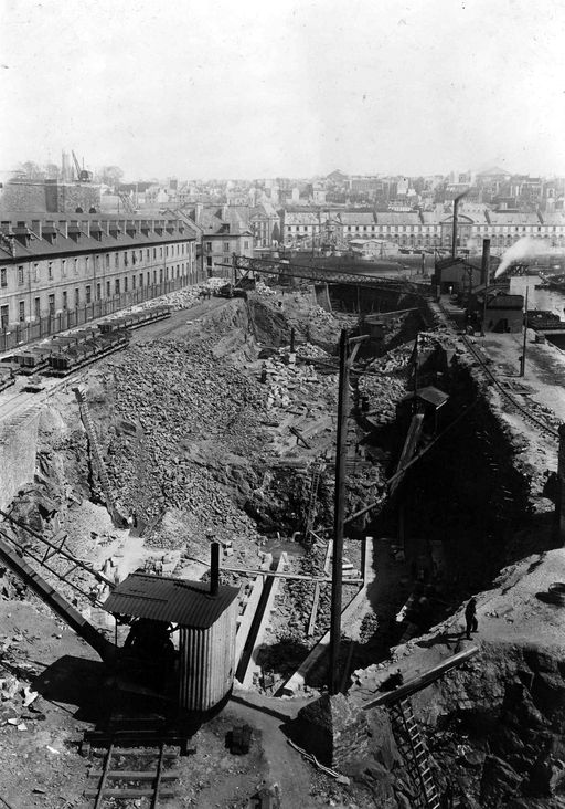 Vue de l'arsenal de Brest entre 1899 à 1902 : travaux d'agrandissement des formes de construction, bassins de radoub de Pontaniou dits formes de Pontaniou. Passage de quatre petites formes à deux grandesImmatriculation